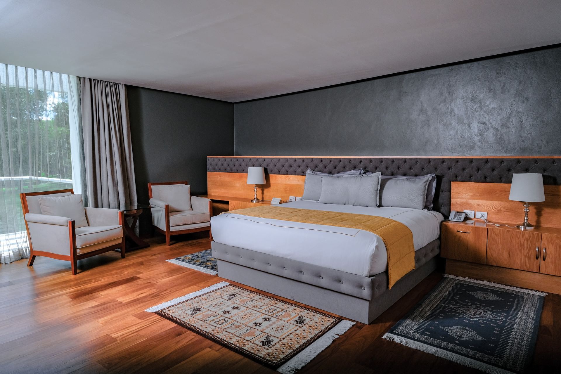 Una Suite Deluxe ofrece una decoración moderna y elegante con pisos de madera, paletas de colores sofisticados, baños de mármol y mobiliario contemporáneo, un balcón con vistas relajantes de jardines naturales propiedad de Hacienda Cantalagua.